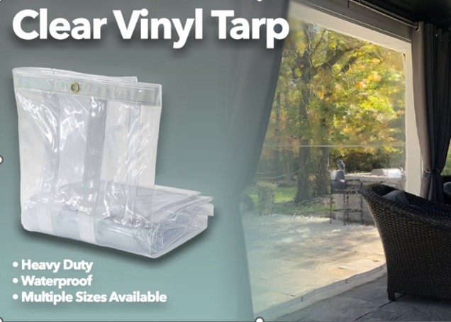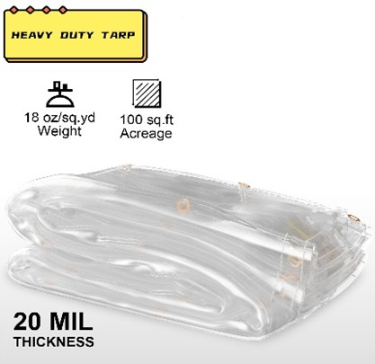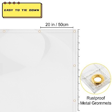 20 Mil PVC Tarp & Reinforced Edges & Easy to Tie Down.No matter what weather conditions surround your busy life, clear vinyl tarp will protect you and your belongings. This 20 mil thick tarpaulin comes with reinforced edges and metal grommets, making it easy to remain sturdy and tie down. It is the best choice for you to protect your greenhouses, patios, pavilions, and outdoor furniture from rain, snow, sunlight, sand, and dirt.