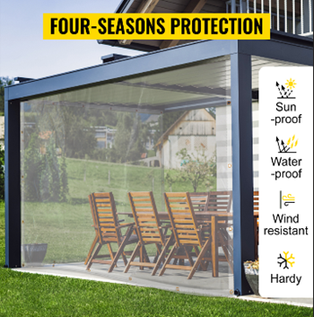 No matter what weather conditions surround your busy life, clear vinyl tarp will protect you and your belongings. This 20 mil thick tarpaulin comes with reinforced edges and metal grommets, making it easy to remain sturdy and tie down. It is the best choice for you to protect your greenhouses, patios, pavilions, and outdoor furniture from rain, snow, sunlight, sand, and dirt.