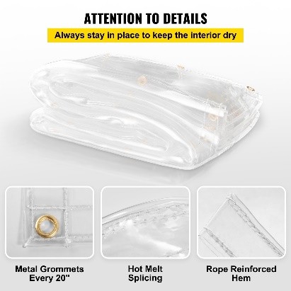 The clear tarp comes with hot melt splicing and rope-reinforced hems, ensuring a sturdy structure that can provide adequate protection.