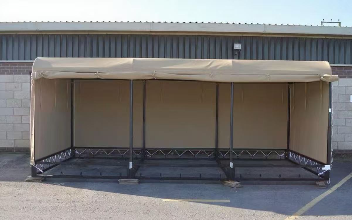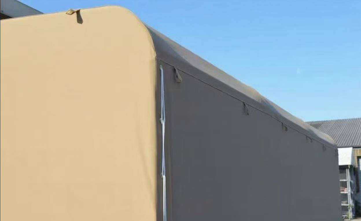 VECTUS Manufacturing design, manufacture and supply army vehicle canvas tarpaulins to the defence market. We were asked to design and manufacture a batch of ten canvas covers for steel frames which attach to the rear of a military vehicles. The fitted canvas tarpaulin measured L5m x W2.5m x H2.5m and was made in traditional beige 407gsm polyester/cotton canvas for breathability.