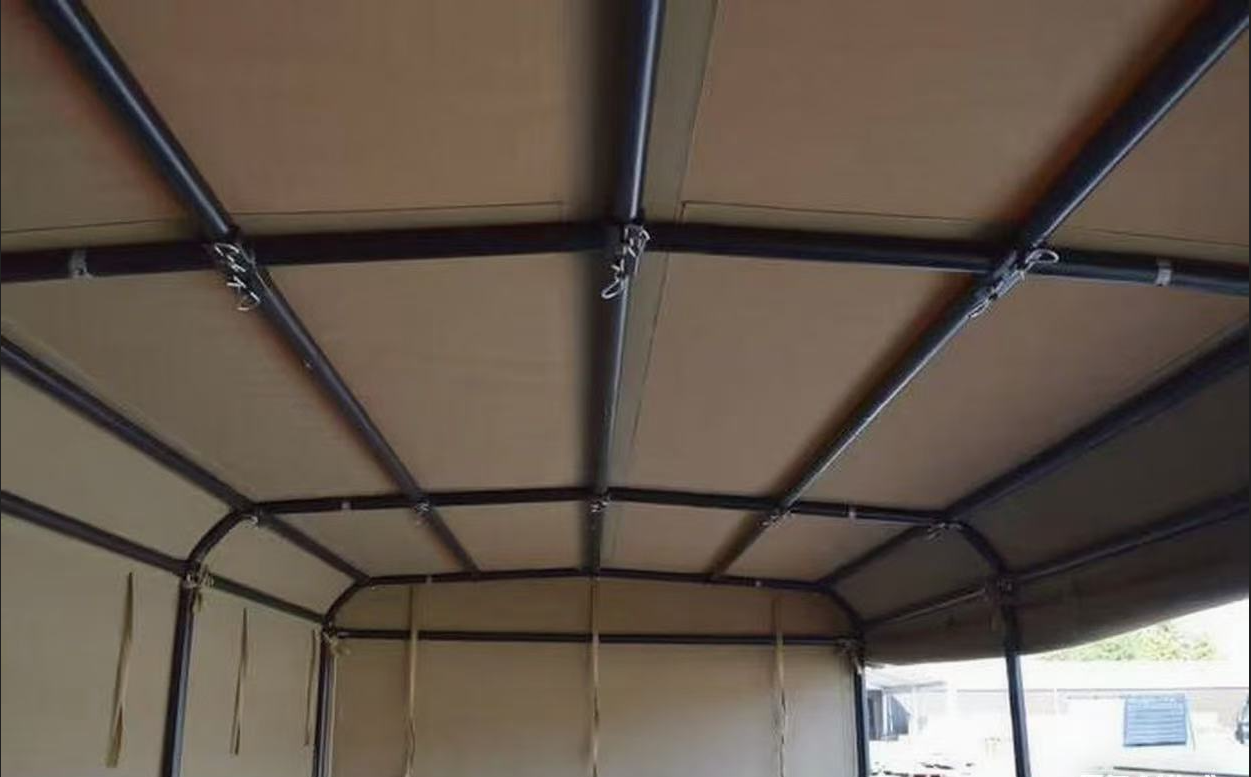 VECTUS Manufacturing design, manufacture and supply army vehicle canvas tarpaulins to the defence market.We were asked to design and manufacture a batch of ten canvas covers for steel frames which attach to the rear of a military vehicles. The fitted canvas tarpaulin measured L5m x W2.5m x H2.5m and was made in traditional beige 407gsm polyester/cotton canvas for breathability.We used brass eyelets and polyester lacing on the corners to allow each side to be opened/closed and easily rolled up. Matching beige webbing ties were used to secure the sides in the rolled-up position.