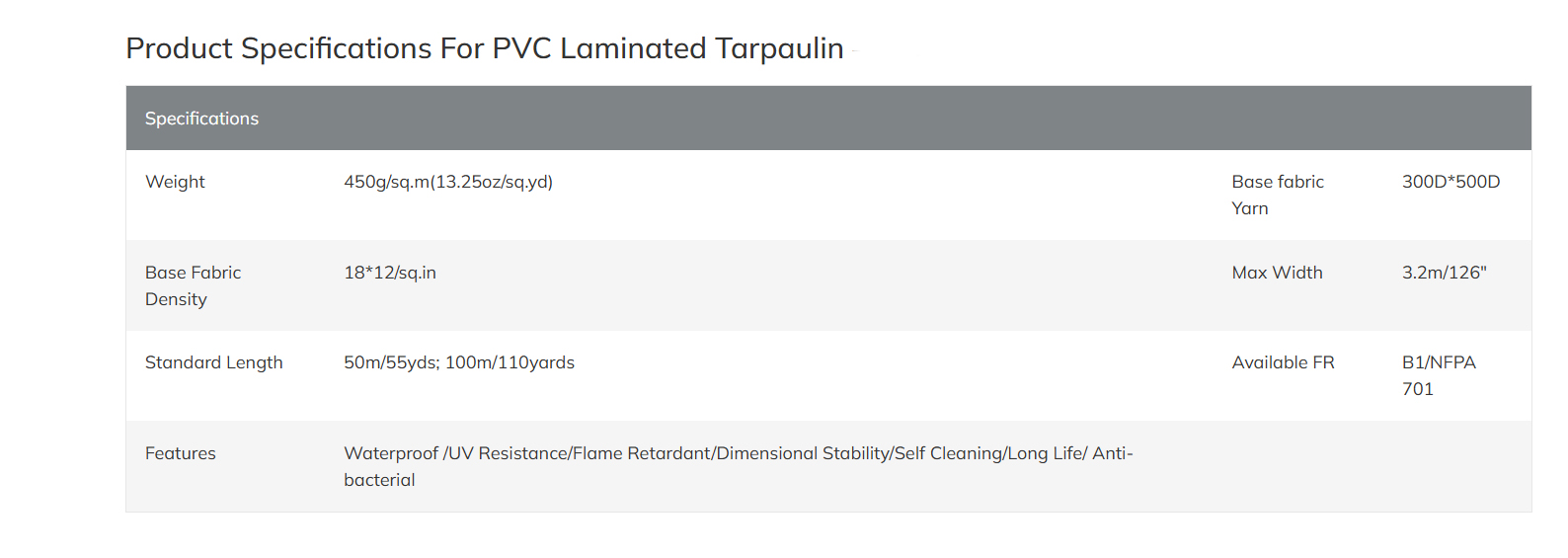 Weight: 450gsm(13.25oz/sq.yd)