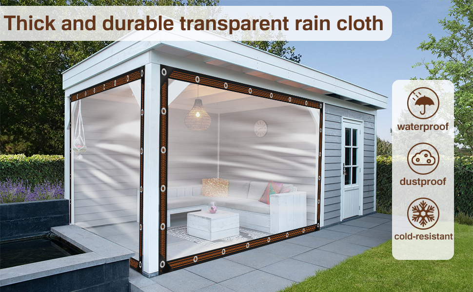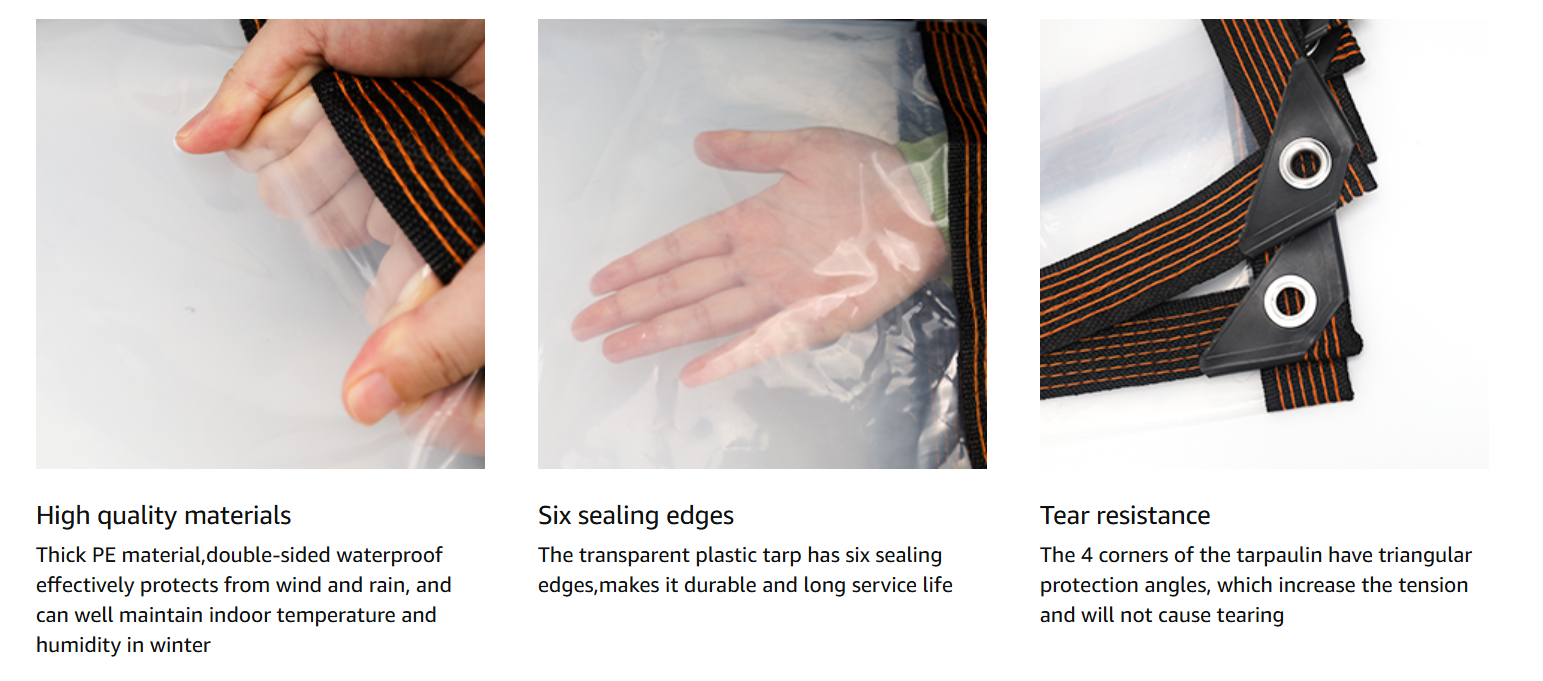 The clear see-through Tarp is made of thick PE material,and the edges are tightly sealed with nylon rope,which is sturdy and durable,and can be used in multiple seasons.There is a metal eyelet every 15.7 inches on the edge of the transparent plastic tarp,the eyelet is made of Aluminum,and each piece of tarp is equipped with polypropylene rope and cable ties,make it easy and quick to install.Our rainproof tarpaulin not only protect your chicken coop well in the winter,also can be used in courtyard, roof, carport, balcony etc.